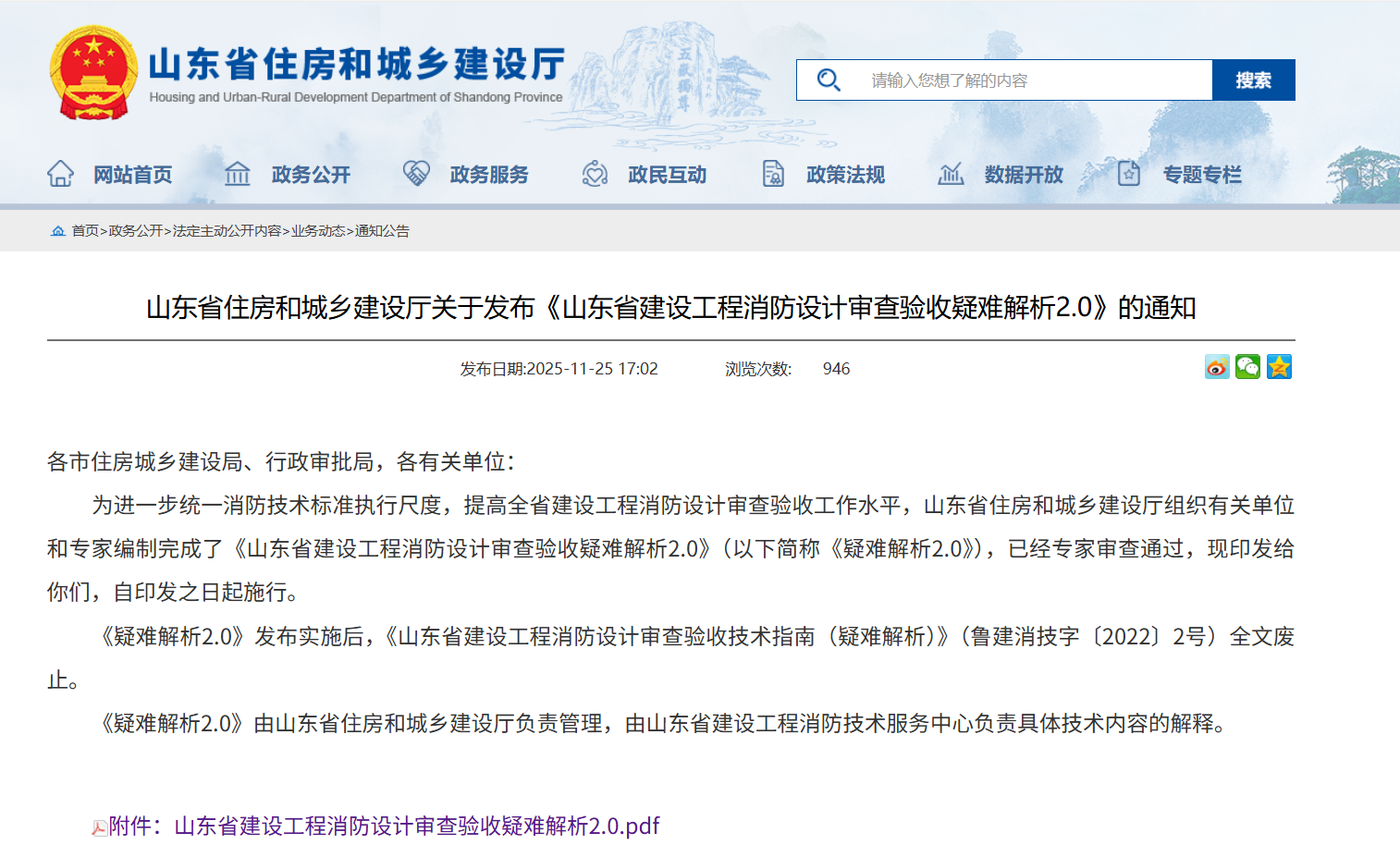 山东省住房和城乡建设厅关于发布《山东省建设工程消防设计审查验收疑难解析2.0》的通知